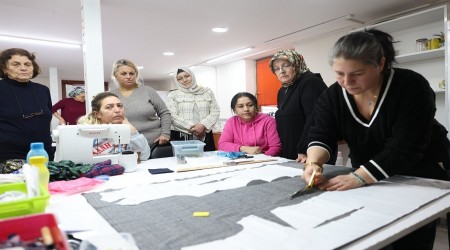 kadın eğitim alıyor. Atölye süresince kadınlar giyim alanında mesleki beceriler edinerek
